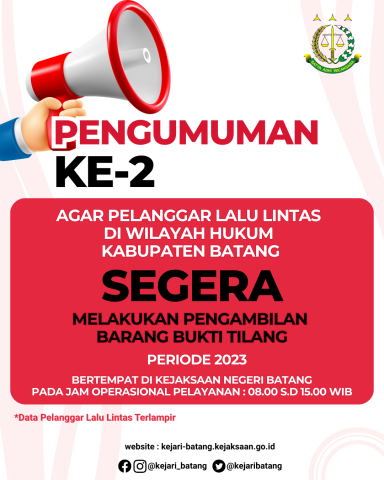 PENGUMUMAN KE-2 PENGAMBILAN BARANG BUKTI PELANGGARAN LALU LINTAS JALAN TERTENTU📢🚦 Mendasari Peraturan Kejaksaan Republik...