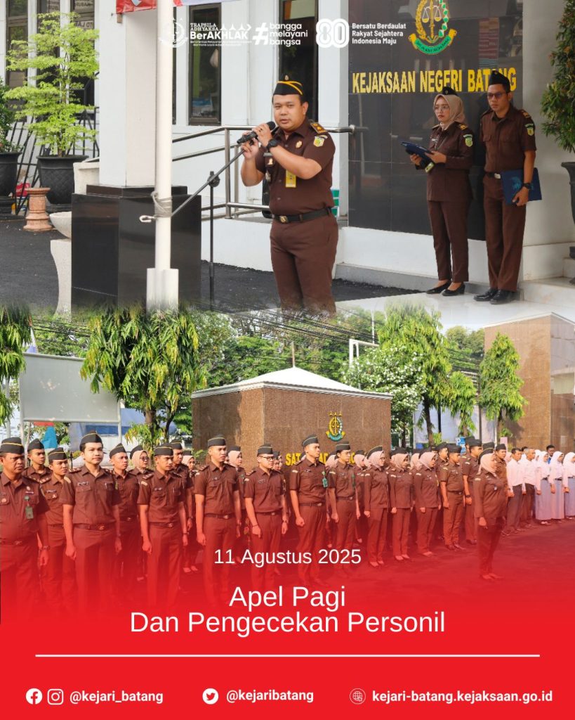 Pada hari Senin, 11 Agustus 2025, bertempat di halaman Kantor Kejaksaan Negeri Batang, telah dilaksanakan kegiatan Apel Pagi dan Pengecekan Personil. Kegiatan ini dipimpin langsung oleh Kepala Sub Bagian Pembinaan Kejaksaan Negeri Batang, Aris Sophian, S.H.,M.H.