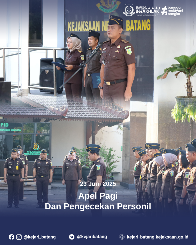 Batang – Pada hari Senin, 23 Juni 2025, bertempat di halaman Kantor Kejaksaan Negeri Batang, telah dilaksanakan kegiatan Apel Pagi dan Pengecekan Personil yang dipimpin langsung oleh Kepala Seksi Tindak Pidana Khusus Kejaksaan Negeri Batang, Eko Hartoyo, S.H., M.H.