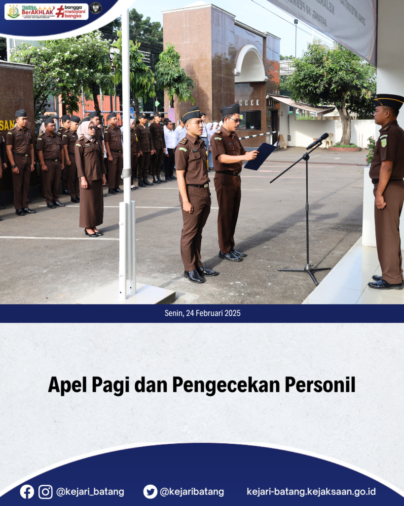 Bahwa pada hari Senin, tanggal 24 Februari 2025, Kepala Seksi Tindak Pidana Khusus Kejaksaan Negeri Batang, Eko Hartoyo, S.H.,M.H. memimpin Kegiatan Apel Pagi dan Pengecekan Personil yang diikuti seluruh Pegawai Kejaksaan Negeri Batang, PPNPN dan siswa siswi magang.