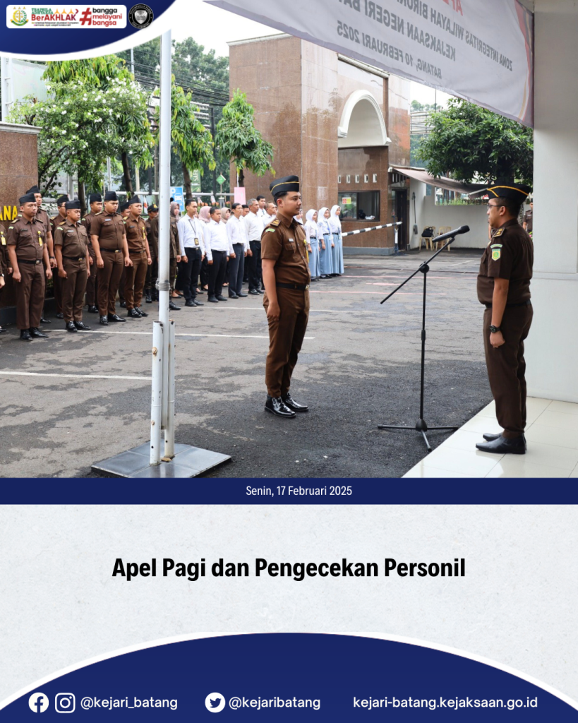 Bahwa pada hari Senin, tanggal 17 Februari 2025, Kepala Seksi Intelijen Kejaksaan Negeri Batang, Dipo Iqbal, S.H. memimpin Kegiatan Apel Pagi dan Pengecekan Personil yang diikuti seluruh pegawai dan PPNPN Kejaksaan Negeri Batang.