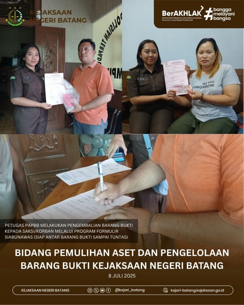Selasa, tanggal 08 Juli 2025. Bidang Pemulihan Aset dan Pengelola Barang Bukti Kejaksaan Negeri Batang telah melaksanakan kegiatan pengembalian barang bukti kepada Saksi/Korban melalui program Formulir SiAbunawas (Siap Antar Barang Bukti Sampai Tuntas).