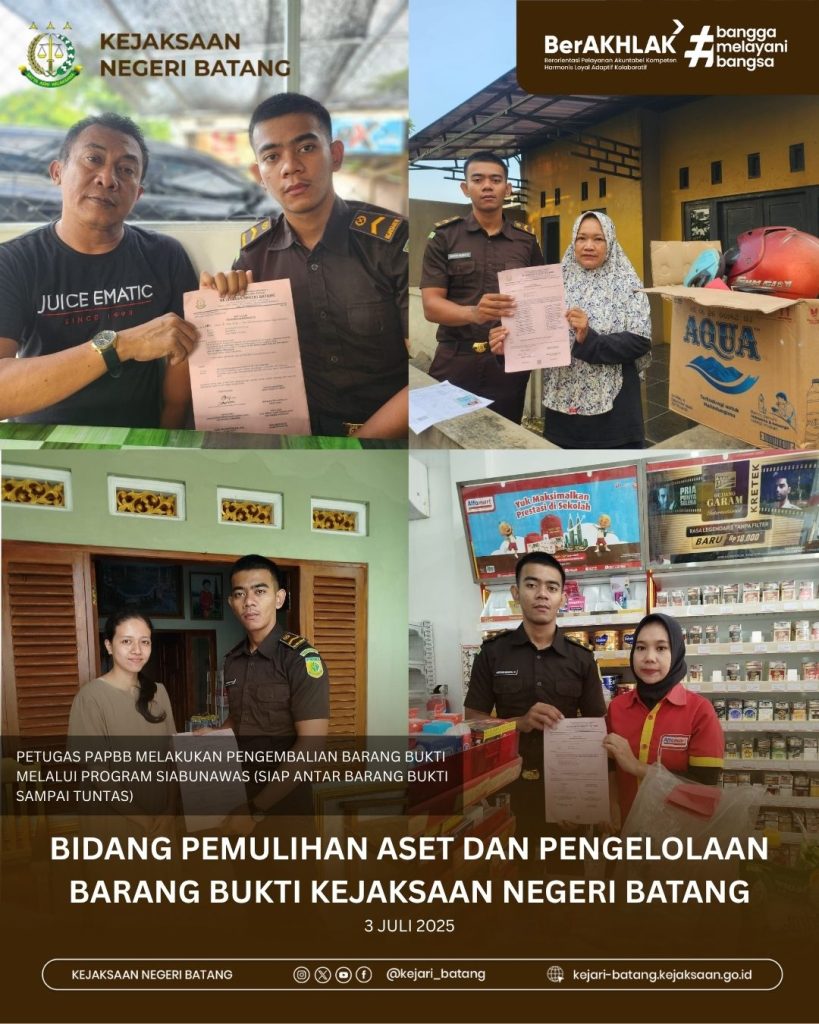 Kamis, tanggal 03 Juli 2025. Bidang Pemulihan Aset dan Pengelola Barang Bukti Kejaksaan Negeri Batang telah melaksanakan kegiatan pengembalikan barang bukti melalui program Formulir SiAbunawas (Siap Antar Barang Bukti Sampai Tuntas) yang berupa :