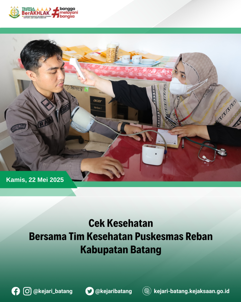 Pada hari Kamis, 22 Mei 2025, telah dilaksanakan kegiatan Cek Kesehatan Pegawai di Ruang Kesehatan Kejaksaan Negeri Batang. Kegiatan ini bekerja sama dengan Tim Kesehatan dari Puskesmas Reban, Kabupaten Batang, sebagai bentuk upaya menjaga kesehatan dan kebugaran para pegawai.