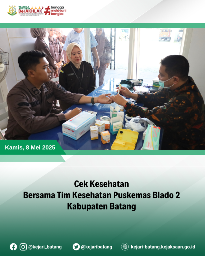 Kamis, 8 Mei 2025 bertempat di Ruang Kesehatan Kejaksaan Negeri Batang telah dilaksanakan Cek Kesehatan Pegawai Kejaksaan Negeri Batang oleh Tim Kesehatan dari Puskesmas Blado 2, Kabupaten Batang.