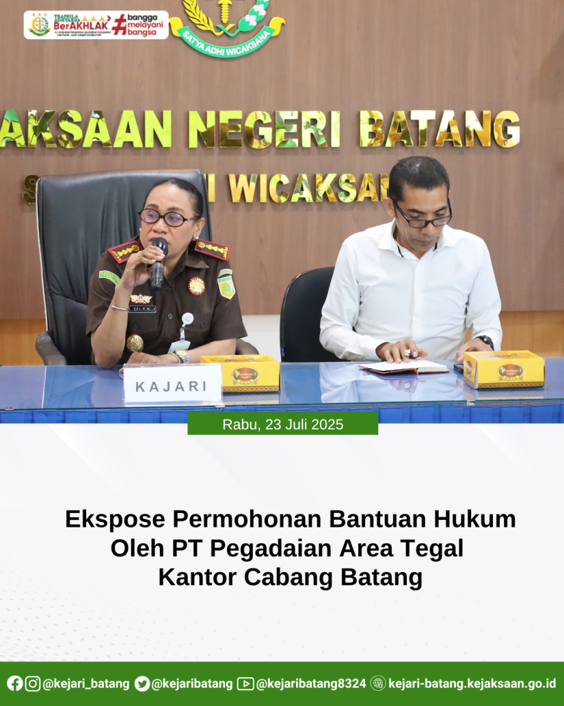 Pada hari Rabu, 23 Juli 2025, bertempat di Kejaksaan Negeri Batang telah dilaksanakan kegiatan Pemaparan/Ekspose Permohonan Bantuan Hukum dari PT Pegadaian Area Tegal Cabang Batang. Permohonan ini diajukan terkait penanganan permasalahan kredit bermasalah yang dihadapi oleh PT Pegadaian Area Tegal Cabang Batang.