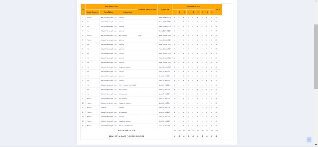 Survei tersebut dilakukan kepada berbagai lapisan masyarakat yang telah memanfaatkan layanan PTSP Kejaksaan Negeri Batang. Beberapa aspek yang dinilai meliputi kesesuaian persyaratan pelayanan, kemudahan prosedur, kecepatan layanan, kesesuaian produk pelayanan, kompetensi petugas, sikap petugas, kualitas sarana dan prasarana publik dan penanganan pengaduan pengguna layanan.