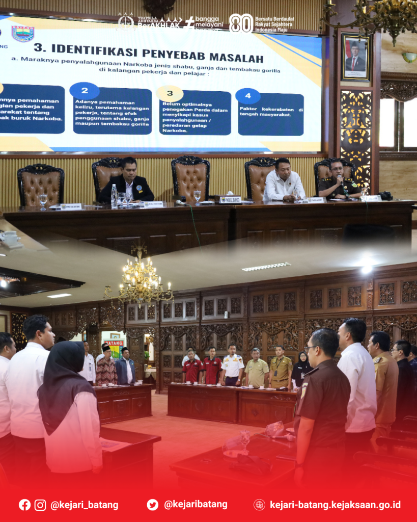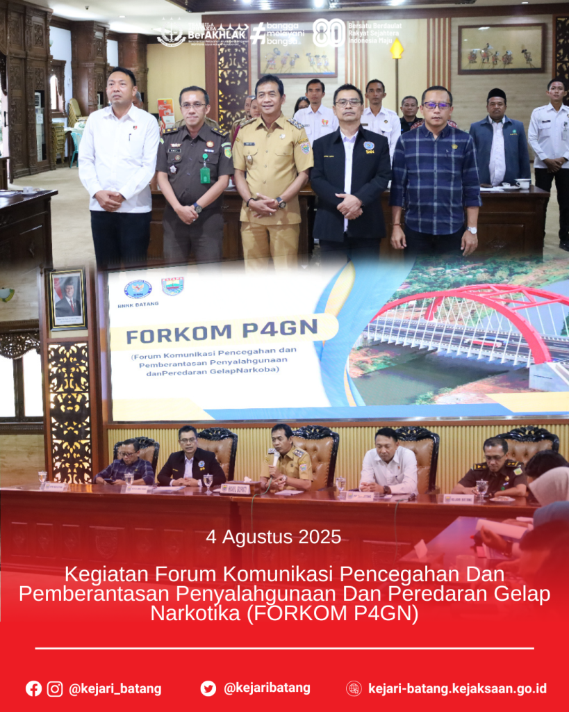 Pada hari Senin, 4 Agustus 2025, bertempat di Aula Kantor Bupati Kabupaten Batang, Kepala Seksi Intelijen, Dipo Iqbal, S.H. Menghadiri Undangan Kegiatan Forum Komunikasi Pencegahan dan Pemberantasan Penyalahgunaan dan Peredaran Gelap Narkotika (FORKOM P4GN) yang diselenggarakan oleh Badan Narkotika Nasional Kabupaten (BNNK) Batang.
