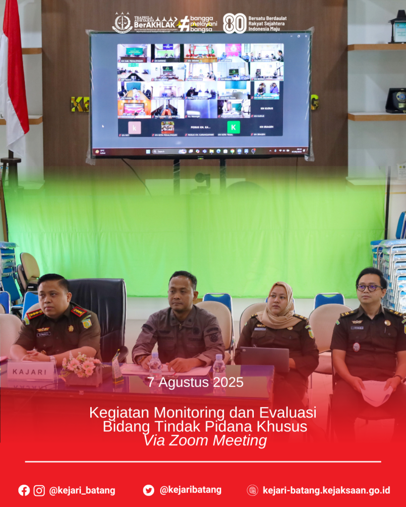 Pada hari Kamis, 7 Agustus 2025, bertempat di Aula Bupati Kabupaten Batang, Kepala Kejaksaan Negeri Batang, Dr. Raymond Ali, S.H., M.H., bersama Kasi dan Kasubsi Pidsus menghadiri kegiatan Monitoring dan Evaluasi (Monev) secara virtual. Sebagai upaya optimalisasi penanganan dan penyelesaian perkara tindak pidana khusus, Kejaksaan Agung melalui Direktorat Pengendalian Operasi Bidang Tindak Pidana Khusus. Kegiatan ini diikuti oleh seluruh Kejaksaan Negeri dan Cabang Kejaksaan Negeri di wilayah Jawa Tengah
