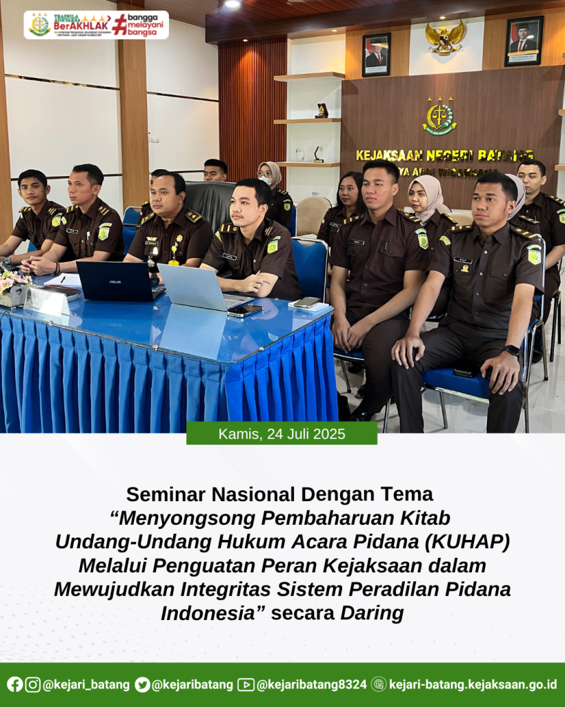 Batang, 24 Juli 2025 — Bertempat di Aula Kejaksaan Negeri Batang, Kepala Sub Bagian Pembinaan, Aris Sophian, S.H., M.H., mewakili Kepala Kejaksaan Negeri Batang, bersama para Calon Pegawai Negeri Sipil (CPNS) Kejaksaan, telah mengikuti Seminar Nasional secara daring melalui Zoom Meeting.