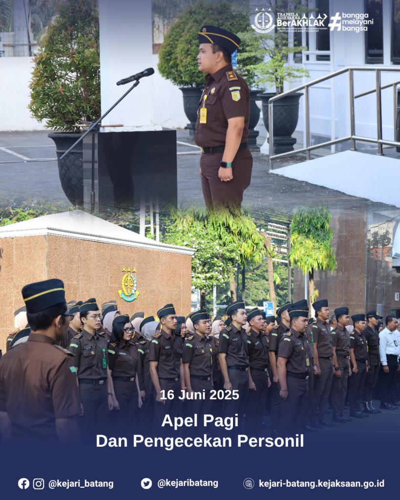 Batang – Pada hari Senin, 16 Juni 2025, bertempat di halaman Kantor Kejaksaan Negeri Batang, telah dilaksanakan kegiatan Apel Pagi dan Pengecekan Personil yang dipimpin langsung oleh Kepala Sub Bagian Pembinaan Kejaksaan Negeri Batang, Aris Sophian, S.H., M.H. Kegiatan ini diikuti oleh seluruh pegawai, Pegawai Pemerintah Non Pegawai Negeri (PPNPN), serta mahasiswa magang sebagai bentuk komitmen bersama terhadap kedisiplinan dan kesiapan dalam menjalankan tugas.