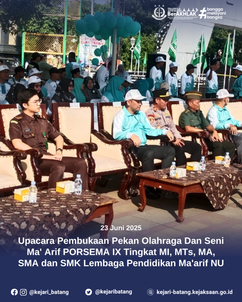 Batang – Pada hari Senin, 23 Juni 2025 pukul 08.30 hingga 09.30 WIB, bertempat di Alun-Alun Kabupaten Batang, Staff Intelijen Kejaksaan Negeri Batang, mewakili Kepala Kejaksaan Negeri Batang, menghadiri kegiatan upacara pembukaan Pekan Olahraga dan Seni Ma’arif (PORSEMA) IX.