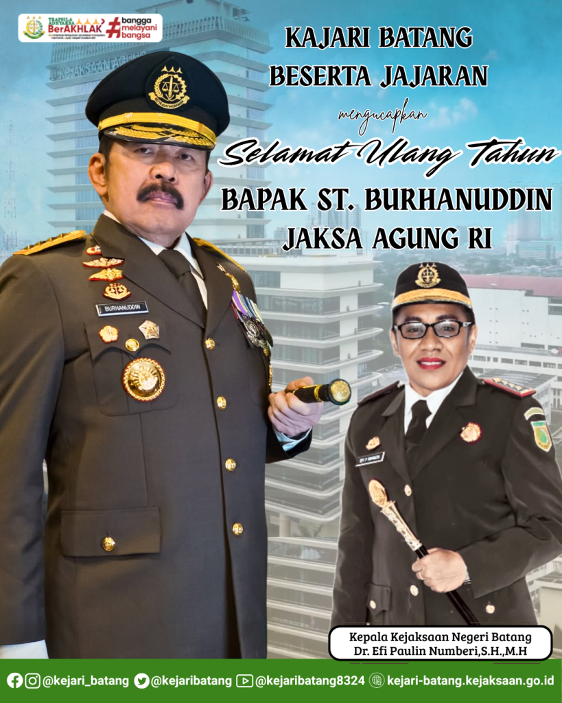 Di momen spesial ini, keluarga besar Kejaksaan Negeri Batang mendoakan semoga Bapak Jaksa Agung senantiasa diberikan kesehatan, kekuatan, serta keberkahan dalam mengemban amanah dan terus menjadi inspirasi bagi insan Adhyaksa di seluruh Indonesia.