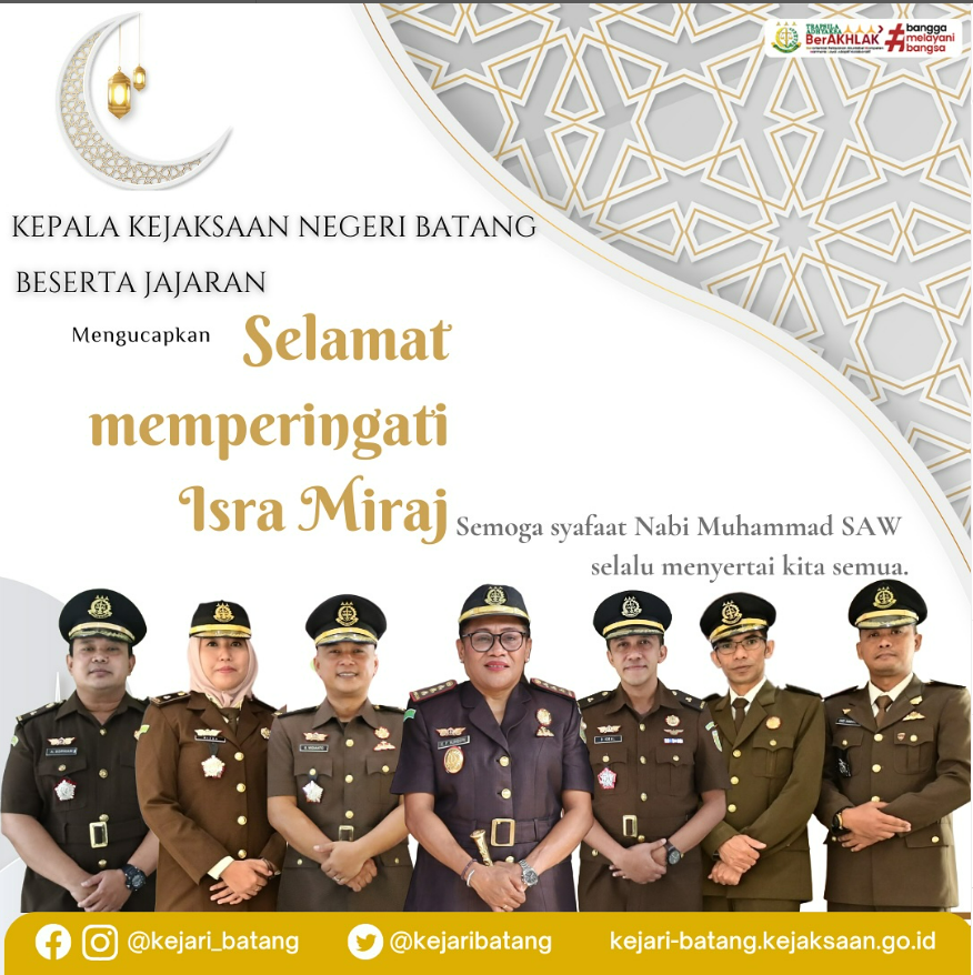 Kepala Kejaksaan Negeri Batang, Dr. Efi Paulin Numberi,S.H.,M.H beserta jajaran mengucapkan Selamat Memperingati Isra Mi’raj Nabi Muhammad SAW.