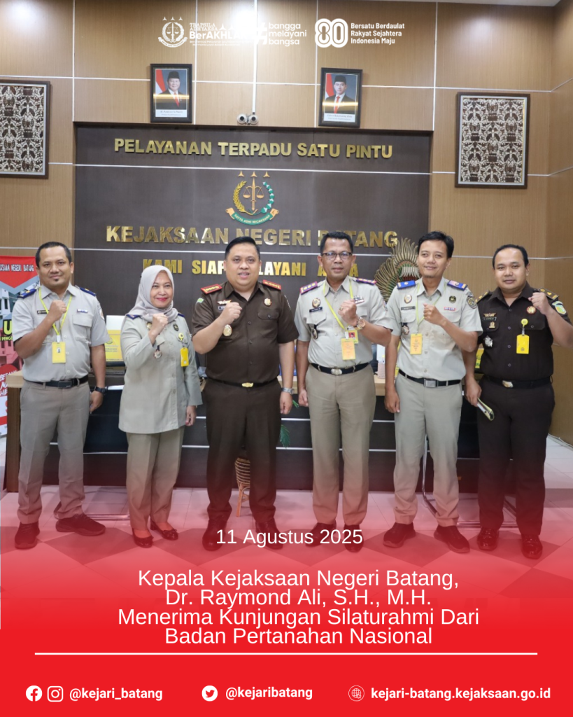 Pada hari Senin, 11 Agustus 2025 Kepala Kejaksaan Negeri Batang, Dr. Raymond Ali, S.H., M.H., menerima kunjungan silaturahmi dari jajaran Badan Pertanahan Nasional (BPN) Kabupaten Batang. Pertemuan ini menjadi ajang untuk mempererat hubungan kelembagaan sekaligus membahas sinergi dalam pelaksanaan tugas dan fungsi masing-masing instansi.