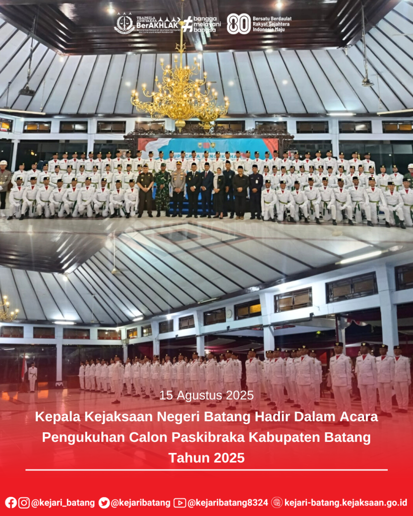 Jumat, 15 Agustus 2025, Kepala Kejaksaan Negeri Batang Dr. Raymond Ali, S.H., M.H. menghadiri acara Pengukuhan Calon Pasukan Pengibar Bendera Pusaka (Paskibraka) Kabupaten Batang Tahun 2025. Kegiatan yang berlangsung khidmat tersebut digelar sebagai tanda resmi bahwa para calon paskibraka siap menjalankan tugas mulia pada Upacara Peringatan Hari Ulang Tahun ke-80 Kemerdekaan Republik Indonesia.