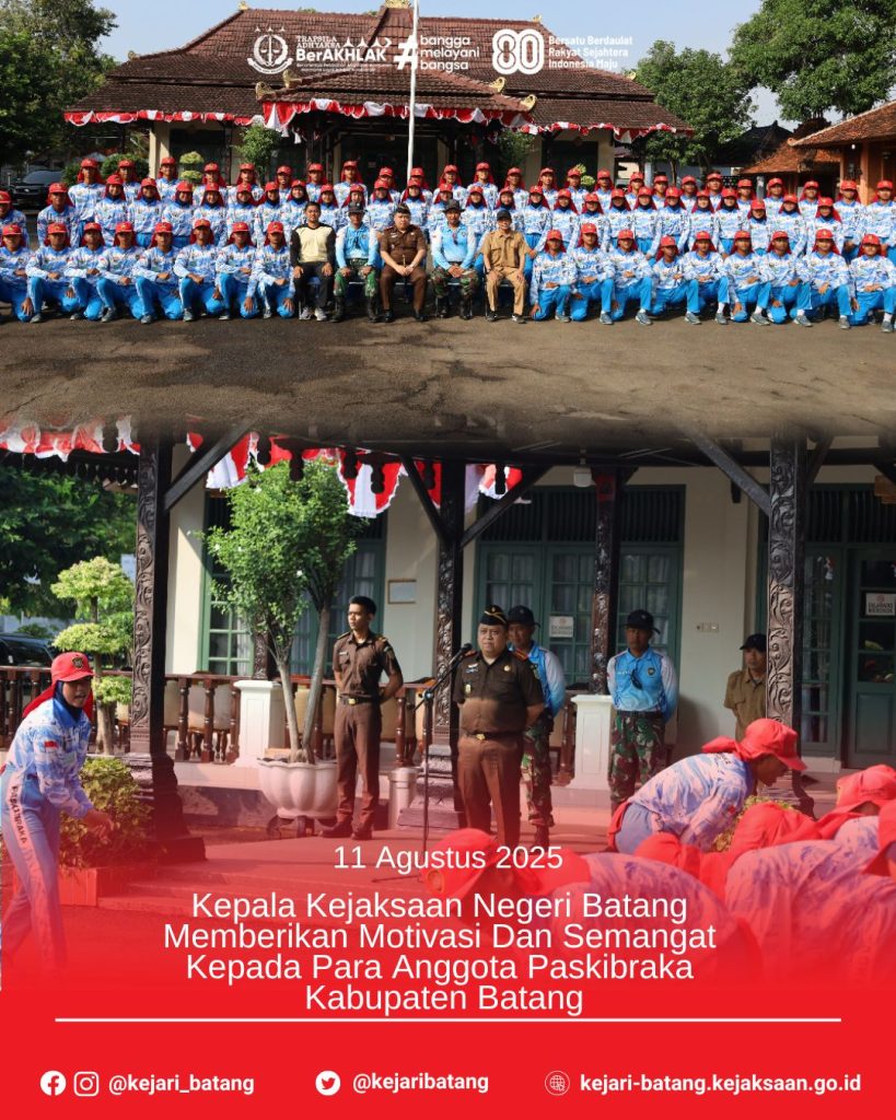 Pada hari Senin, 11 Agustus 2025, bertempat di Halaman Rumah Dinas Bupati Batang, Kepala Kejaksaan Negeri Batang, Dr. Raymond Ali, S.H., M.H., berkesempatan memberikan motivasi dan semangat kepada para Calon Pasukan Pengibar Bendera Pusaka (Paskibraka) Kabupaten Batang dalam rangka persiapan pelaksanaan Upacara Peringatan Hari Ulang Tahun ke-80 Kemerdekaan Republik Indonesia tahun 2025.
