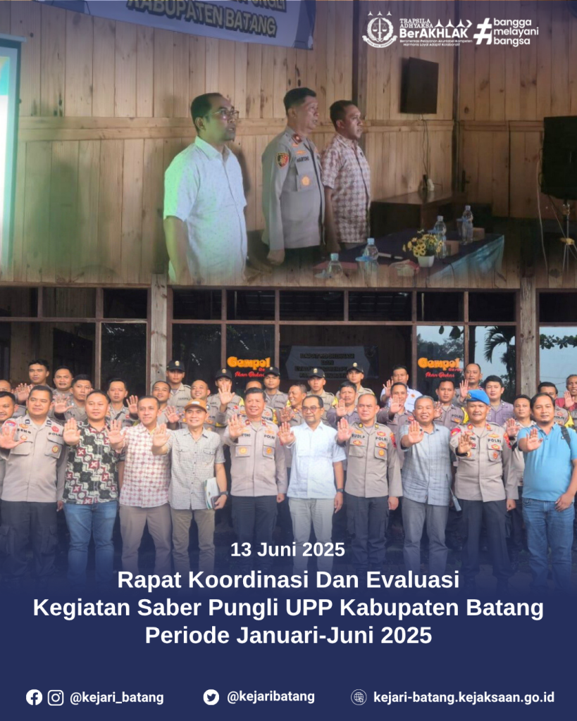 Batang, Jumat 13 Juni 2025 — Kepala Seksi Intelijen Kejaksaan Negeri Batang, Dipo Iqbal, S.H., menghadiri Rapat Koordinasi dan Evaluasi Kegiatan Satuan Tugas Sapu Bersih Pungutan Liar (Saber Pungli) Unit Pemberantasan Pungli (UPP) Kabupaten Batang untuk periode Januari hingga Juni 2025.