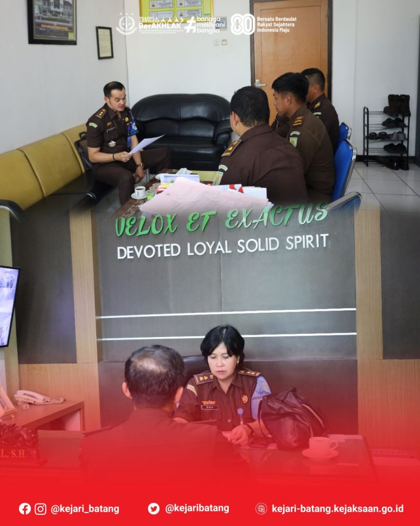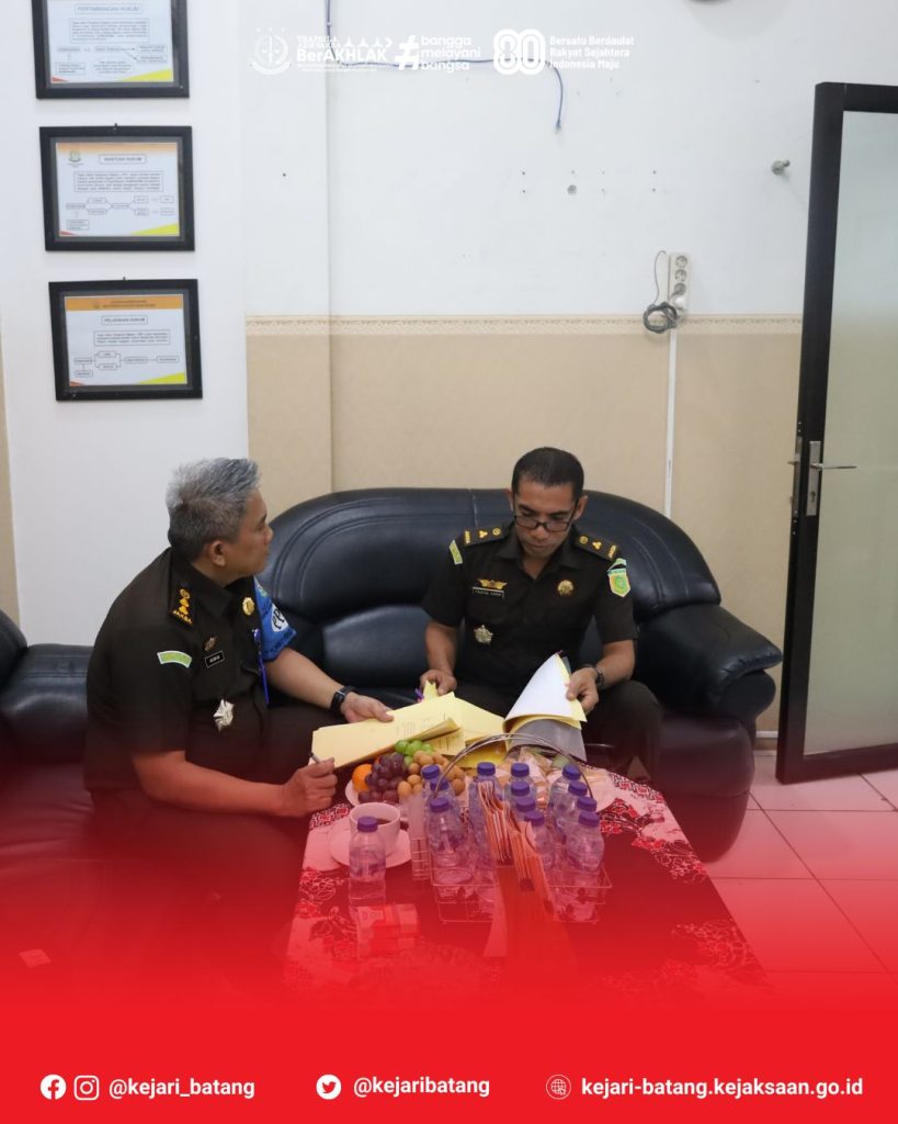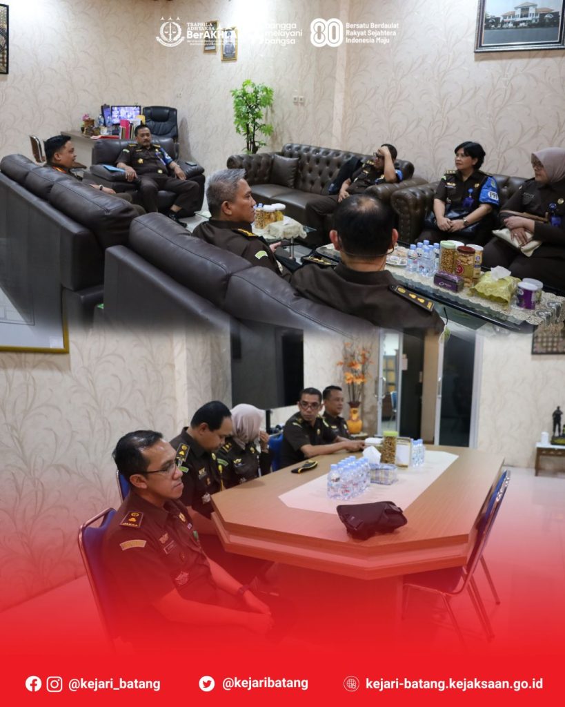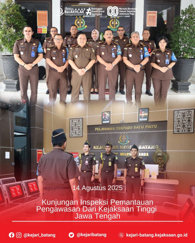 Pada hari Kamis, 14 Agustus 2025, bertempat di Kantor Kejaksaan Negeri Batang, Kepala Kejaksaan Negeri Batang, Dr. Raymond Ali, S.H., M.H., menerima kujungan Asisten Pengawasan Kejaksaan Tinggi Jawa Tengah, Gatot Guno Sembodo, S.H., M.H. bersama Tim Pemeriksa dalam rangka Inspeksi Pemantauan Pengawasan Dari Kejaksaan Tinggi Jawa Tengah.