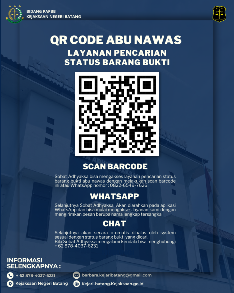 Kini Sobat Adhyaksa dapat mengakses layanan pencarian barang bukti melalui scan QR CODE ABU NAWAS atau sobat adhyaksa dapat mengubungi nomor WhatsApp 0822-6549-7626 atau klik link berikut : https://wa.link/676usv