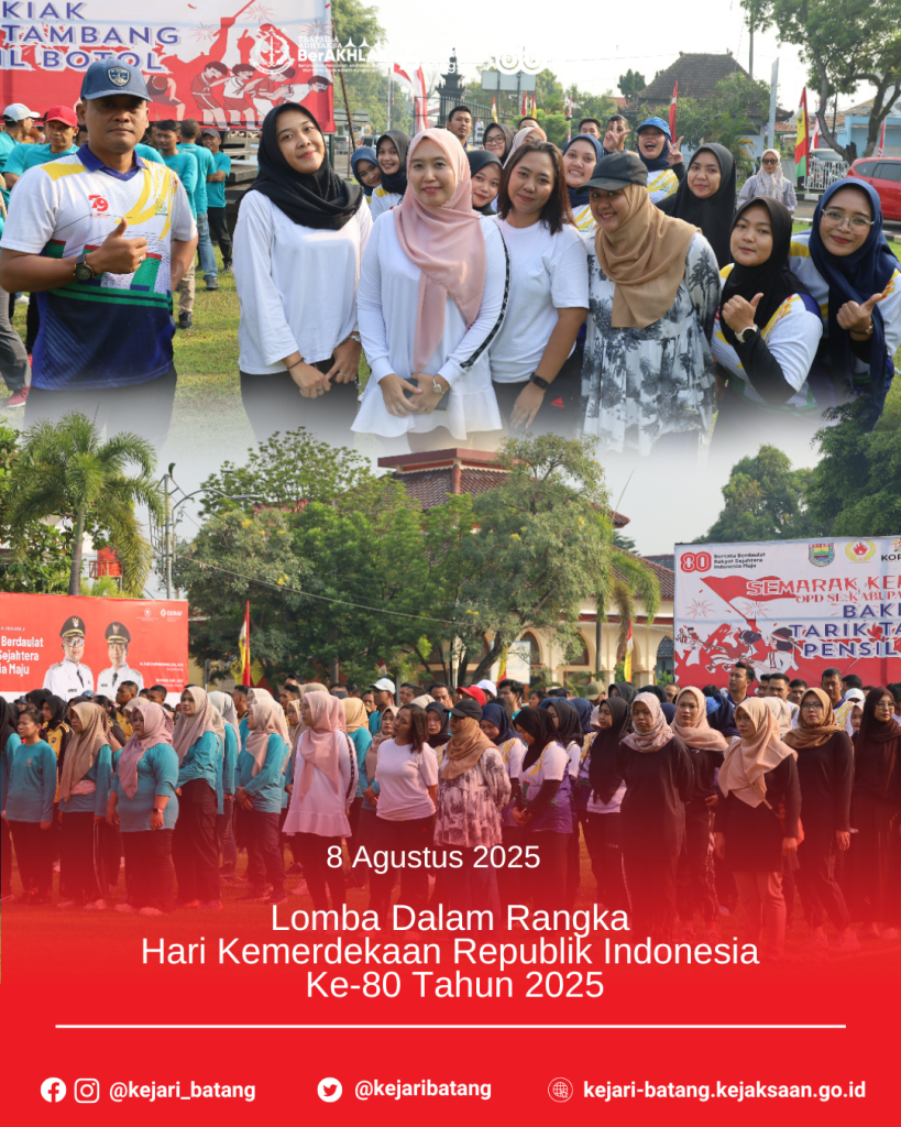 Pada hari Jumat, 8 Agustus 2025, bertempat di Halaman Pendopo Kabupaten Batang, Seluruh Pegawai Kejaksaan Negeri Batang, mengikuti Kegiatan Lomba Dalam rangka memeriahkan Hari Kemerdekaan Republik Indonesia ke-80 tahun 2025.