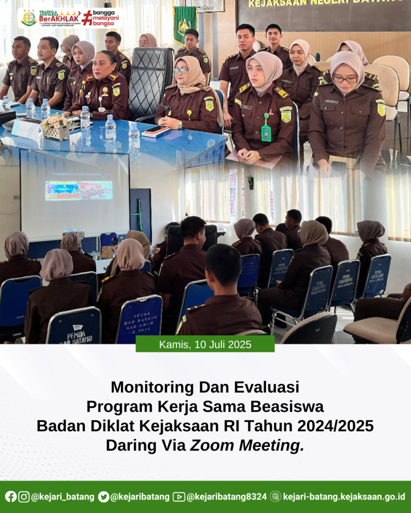 Batang, 10 Juli 2025 — Kepala Kejaksaan Negeri Batang, Dr. Efi Paulin Numberi,S.H.,M.H. beserta Staff turut serta dalam kegiatan Monitoring dan Evaluasi Program Kerja Sama Beasiswa Badan Pendidikan dan Pelatihan (Badiklat) Kejaksaan RI Tahun 2024/2025, yang diselenggarakan secara daring melalui Zoom Meeting pada hari Kamis, 10 Juli 2025.