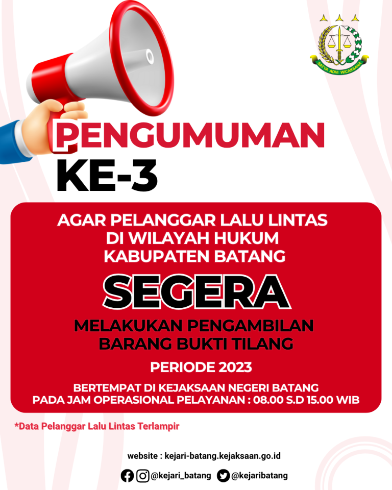 PENGUMUMAN KE-3 PENGAMBILAN BARANG BUKTI PELANGGARAN LALU LINTAS JALAN TERTENTU📢🚦 Mendasari Peraturan Kejaksaan Republik...