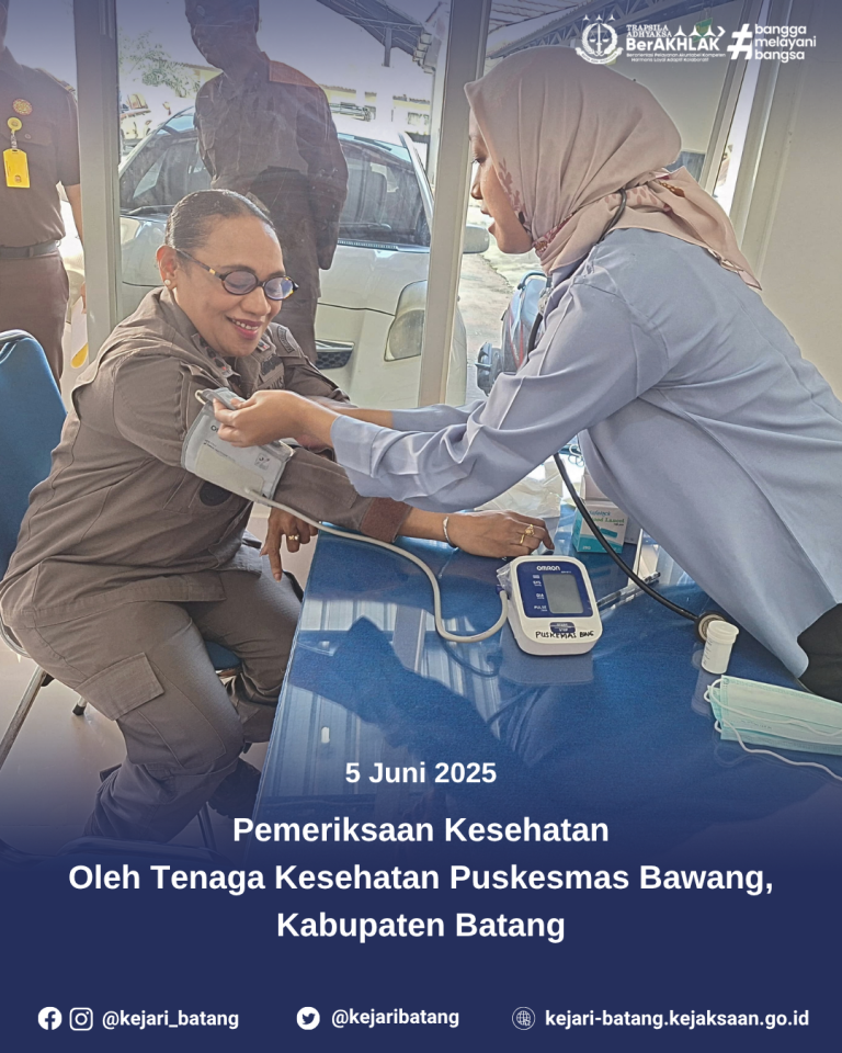 1 min read Uncategorized Pemeriksaan Kesehatan Oleh Tenaga Kesehatan Puskesmas Bawang, Kabupaten Batang. kejbatang Juni 5, 2025 Batang, Kamis 5 Juni 2025 — Bertempat di Ruang Kesehatan Kejaksaan Negeri Batang, telah...Read More