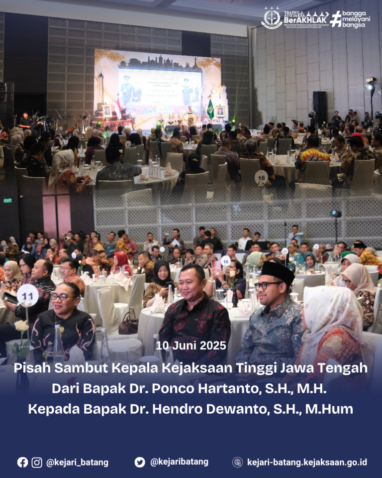 1 min read Uncategorized Kepala Kejaksaan Negeri Batang, Dr. Efi Paulin Numberi,S.H.M.H., Menghadiri Kegiatan Pisah Sambut Kepala Kejaksaan Tinggi Jawa Tengah. kejbatang Juni 11, 2025 Batang, 10 Juni 2025 – Kepala Kejaksaan Negeri Batang, Dr. Efi Paulin Numberi,S.H.M.H., menghadiri...Read More