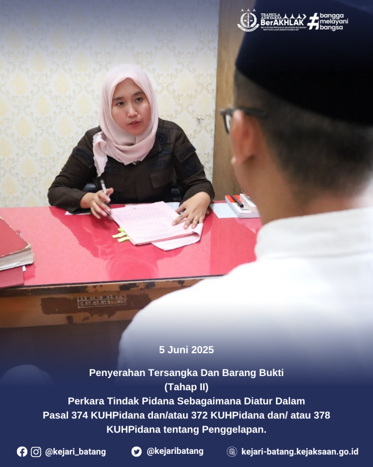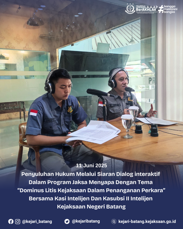 1 min read Uncategorized KEJAKSAAN NEGERI BATANG GELAR PENYULUHAN HUKUM MELALUI PROGRAM “JAKSA MENYAPA” DI RRI PRO 1 SEMARANG kejbatang Juni 11, 2025 Semarang, Rabu 11 Juni 2025 — Kejaksaan Negeri Batang kembali menunjukkan komitmennya dalam memberikan...Read More