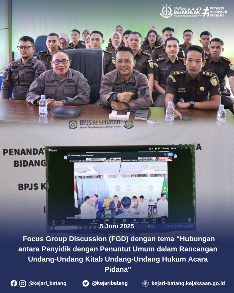 1 min read Uncategorized Focus Group Discussion (FGD) dengan tema “Hubungan antara Penyidik dengan Penuntut Umum dalam Rancangan Undang-Undang Kitab Undang-Undang Hukum Acara Pidana” kejbatang Juni 5, 2025 Bahwa pada hari Kamis, 5 Juni 2025, bertempat di Aula Kejaksaan Negeri Batang Kepala...Read More