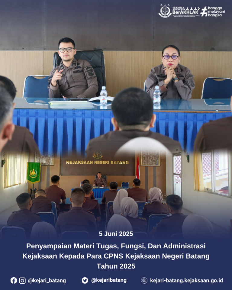 1 min read Uncategorized Penyampaian Materi Tugas, Fungsi, Dan Administrasi Kejaksaan Kepada Para CPNS Kejaksaan Negeri Batang Tahun 2025 kejbatang Juni 5, 2025 Bahwa pada hari Kamis, 5 Juni 2025 bertempat di Aula Kejaksaan Negeri Batang, Kepala...Read More