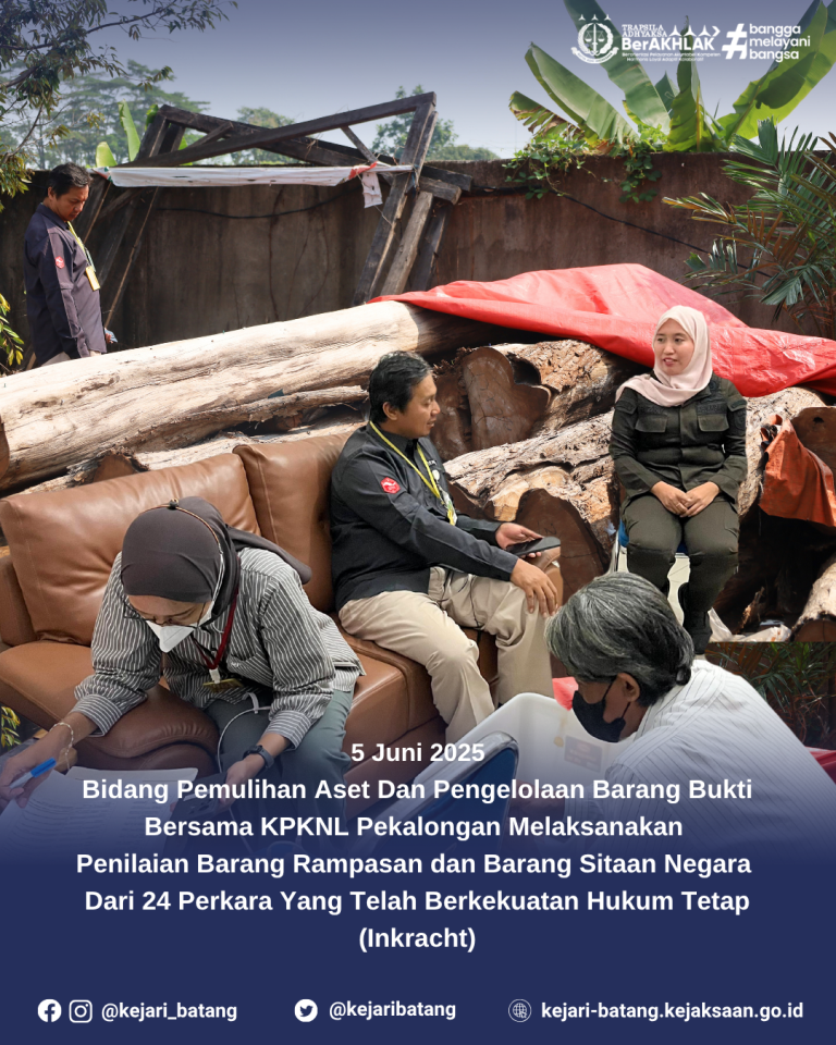 1 min read Uncategorized Bidang Pemulihan Aset Dan Pengelolaan Barang Bukti Kejaksaan Negeri Batang Bersama KPKNL Pekalongan MelaksanakanPenilaian Barang Rampasan dan Barang Sitaan Negara Dari 24 Perkara Yang Telah Berkekuatan Hukum Tetap (Inkracht). kejbatang Juni 5, 2025 Batang, Kamis 5 Juni 2025 — Bidang Pemulihan Aset dan Pengelolaan Barang Bukti Kejaksaan...Read More