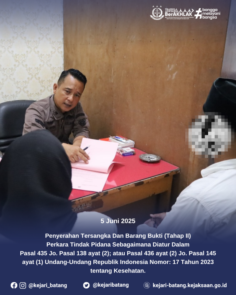 1 min read Uncategorized Penyerahan Tersangka Dan Barang Bukti (Tahap II) Perkara Tindak Pidana Sebagaimana Diatur Dalam Pasal 435 Jo. Pasal 138 ayat (2); atau Pasal 436 ayat (2) Jo. Pasal 145 ayat (1) Undang-Undang Republik Indonesia Nomor: 17 Tahun 2023 tentang Kesehatan. kejbatang Juni 5, 2025 Kamis, 5 Juni 2025 | Kejaksaan Negeri Batang Telah dilaksanakan Penyerahan Tersangka dan Barang...Read More