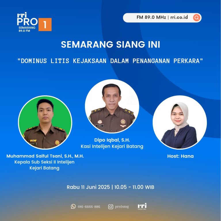 1 min read Uncategorized Siaran Jaksa Menyapa Bersama Kasi Intelijen Dan Kasubsi II Intelijen Kejaksaan Negeri Batang Dengan Tema Dominus Litis Kejaksaan Dalam Penaganan Perkara. kejbatang Juni 10, 2025 🎙️ Stay Tune! Siaran Jaksa Menyapa 🎙️ Jangan lewatkan obrolan hangat bersama Kasi Intelijen...Read More