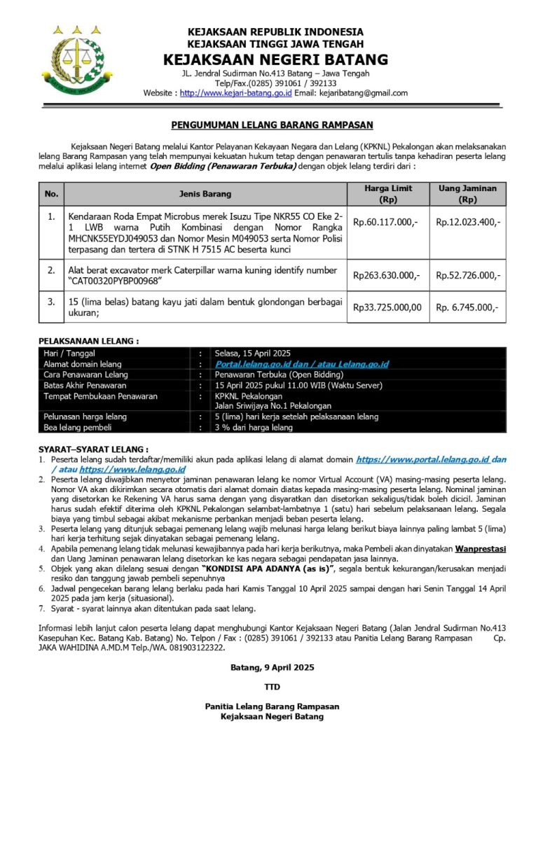 Pengumuman Lelang Barang Rampasan secara Online melalui Lelang.go.id oleh Bidang Pemulihan Aset dan Pengelolaan...
