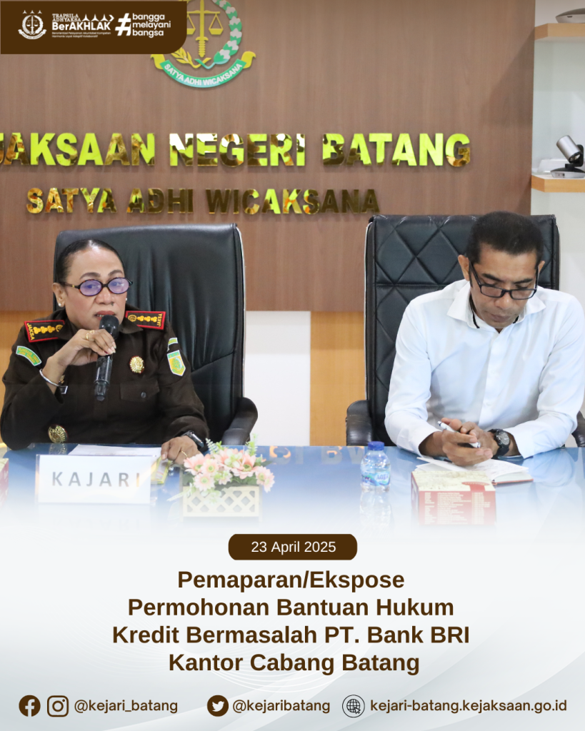 Bahwa pada hari Rabu, 23 April 2025 bertempat di Aula Kejaksaan Negeri Batang telah dilaksanakan Pemaparan/Ekspose Permohonan Bantuan Hukum Kredit Bermasalah PT. Bank BRI Kantor Cabang Batang.