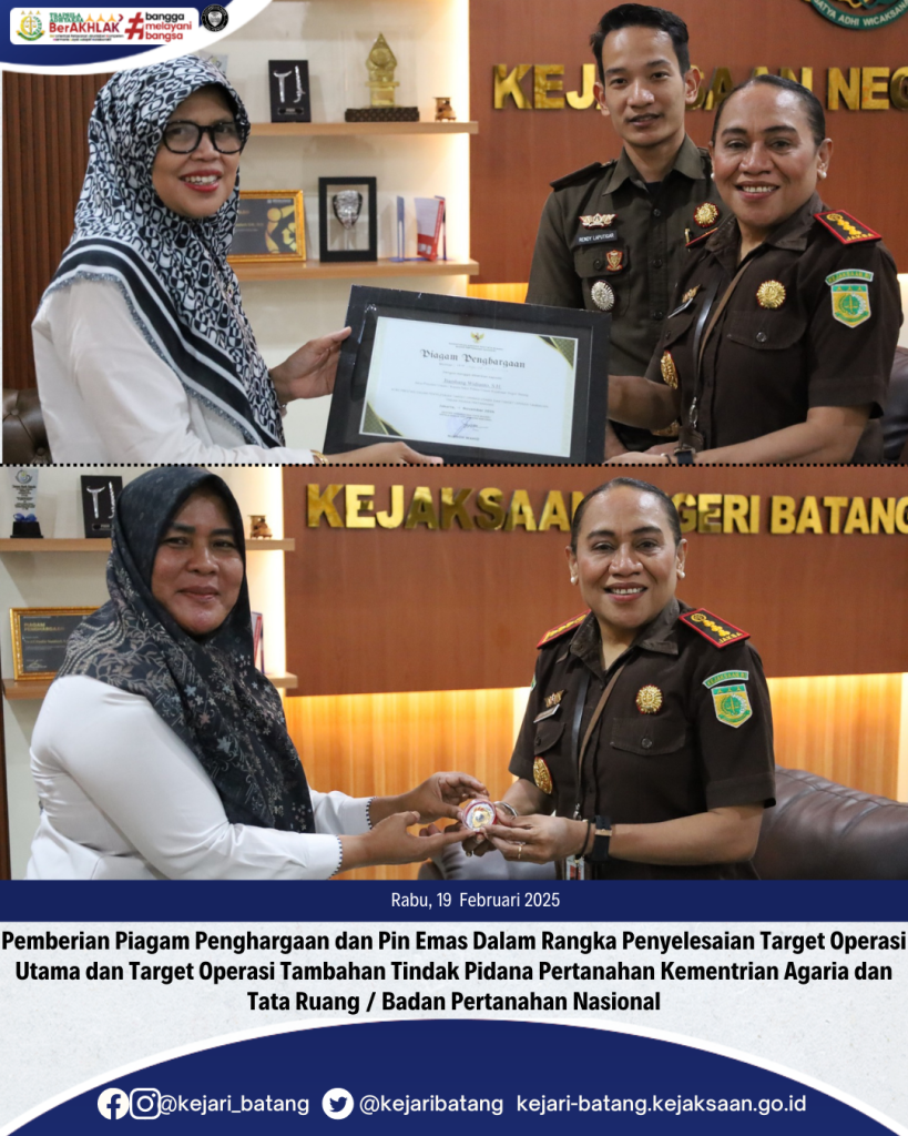 Bahwa pada hari Rabu, 19 Februari 2025 bertempat di Kejaksaan Negeri Batang, Kepala Kejaksaan Negeri Batang Dr. Efi Paulin Numberi, S.H., M.H. telah menerima Pemberian Piagam Penghargaan dan Pin Emas Dalam Rangka Penyelesaian Target Operasi Utama dan Target Operasi Tambahan Tindak Pidana Pertanahan Kementrian Agaria dan Tata Ruang / Badan Pertanahan Nasional Tahun 2024 berdasarkan Keputusan Menteri Agaria dan Tata Ruang / Badan Pertanahan Nasional Nomor 2362 / SK-SK.05 / XI/ 2024.