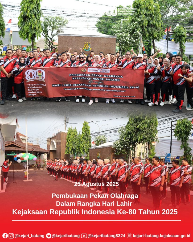 Pada hari Senin, 25 Agustus 2025, bertempat di Halaman Kejaksaan Negeri Batang, telah dilaksanakan Pembukaan Pekan Olahraga Kejaksaan Negeri Batang dalam rangka Hari Lahir Kejaksaan Republik Indonesia Ke-80 Tahun 2025. Pembukaan Pekan Olahraga dipimpin langsung oleh Kepala Kejaksaan Negeri Batang, Dr. Raymond Ali, S.H., M.H., dan diikuti oleh seluruh jajaran pegawai Kejaksaan Negeri Batang di dampingi Ketua Ikatan Adhyaksa Dharmakarini Daerah Batang, Ny. Yeni Raymond beserta Anggota Ikatan Adhyaksa Dharmakarini Daerah Batang.