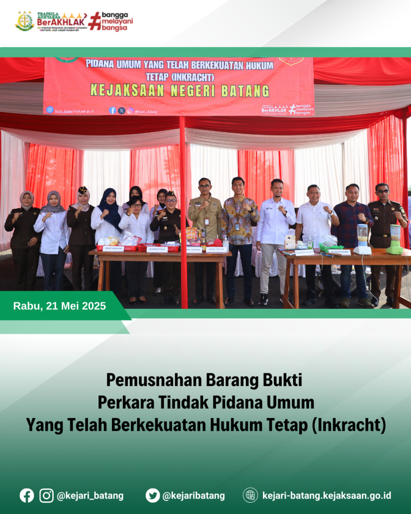Bidang PAPBB Kejaksaan Negeri Batang telah melaksanakan Pemusnahan Barang Bukti Perkara Tindak Pidana Umum yang telah memiliki kekuatan hukum tetap (inkracht). Kegiatan ini merupakan bagian dari upaya penegakan hukum yang transparan, akuntabel, dan memberikan kepastian hukum kepada masyarakat.