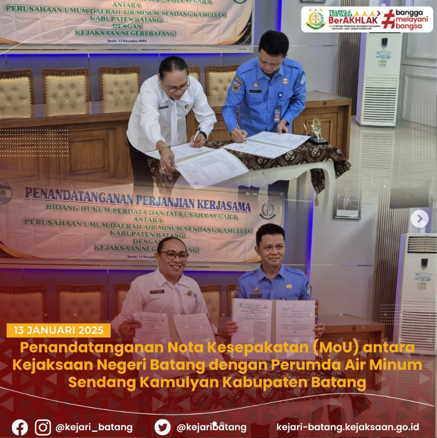 Bahwa pada Hari Senin, 13 Januari 2025 bertempat di Aula Perumda Air Minum Sendang Kamulyan Kabupaten Batang, telah dilaksanakan Penandatanganan Nota Kesepakatan (MoU) antara Kejaksaan Negeri Batang dengan Perumda Air Minum Sendang Kamulyan Kabupaten Batang.