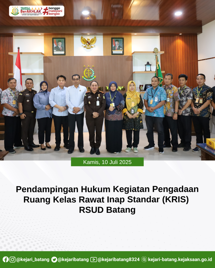 Batang, 10 Juli 2025 – Kejaksaan Negeri Batang menunjukkan komitmennya dalam mendukung program strategis pemerintah daerah dengan melaksanakan kegiatan pendampingan hukum terhadap pengadaan Ruang Kelas Rawat Inap Standar (KRIS) RSUD Batang.
