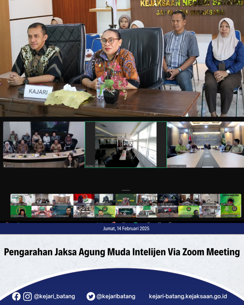 Pada hari Jumat, 14 Februari 2025, bertempat di Aula Kejaksaan Negeri Batang, Kepala Kejaksaan Negeri Batang, Dr. Efi Paulin Numberi, S.H., M.H., bersama dengan jajaran Intelijen Kejaksaan Negeri Batang, mengikuti pengarahan yang disampaikan oleh Jaksa Agung Muda Intelijen melalui Zoom Meeting.