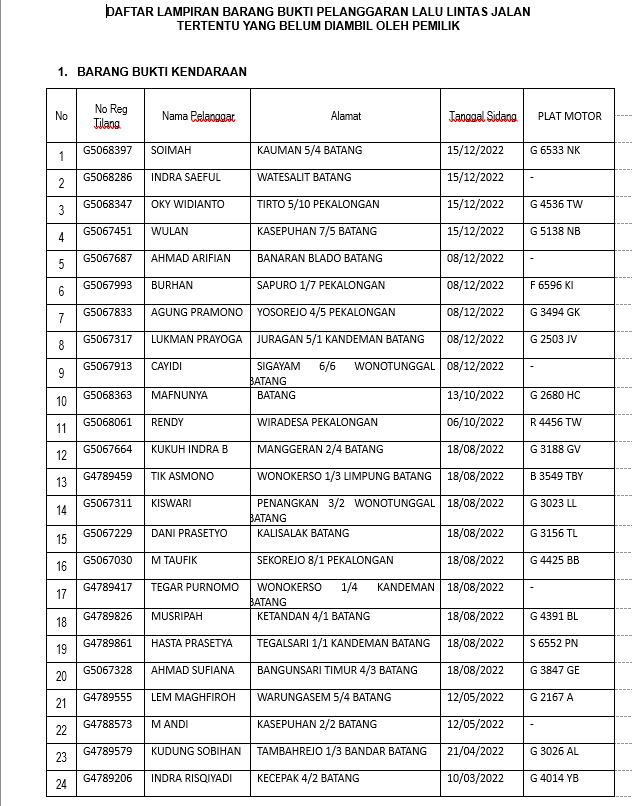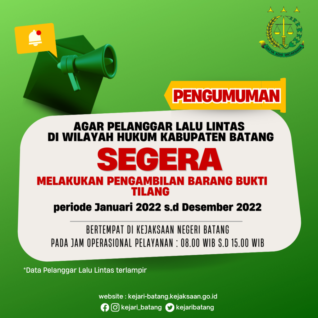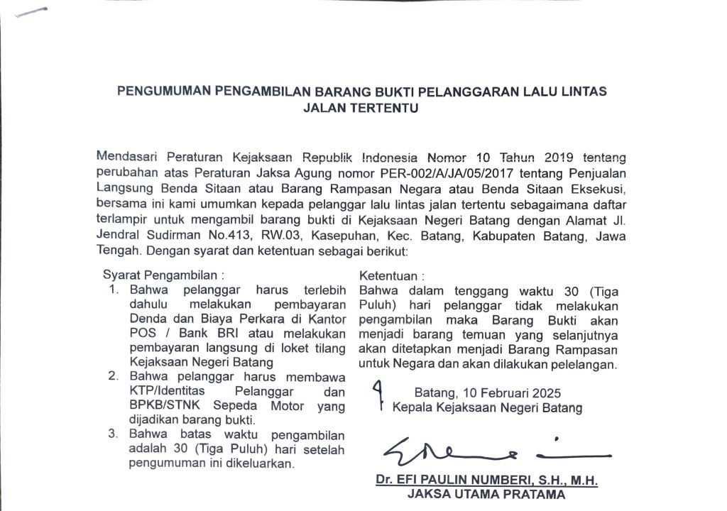 Mendasari Peraturan Kejaksaan Republik Indonesia Nomor 10 Tahun 2019 tentang perubahan atas Peraturan Jaksa Agung nomor PER-002/A/JA/05/2017 tentang Penjualan Langsung Benda Sitaan atau Barang Rampasan Negara atau Benda Sitaan Eksekusi bersama ini kami umumkan kepada Pelanggar lalu lintas jalan tertentu sebagaimana daftar terlampir untuk mengambil barang bukti di Kejaksaan Negeri Batang yang beralamat di Jl. Jendral Sudirman No. 413, RW 03, Kasepuhan, Kecamatan Batang, Kabupatan Batang, Jawa Tengah. Dengan syarat dan ketentuan sebagai berikut :