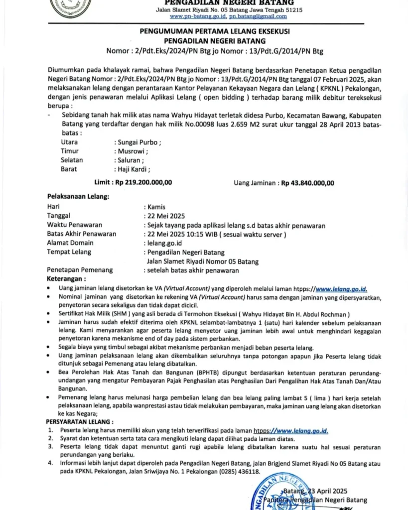 Lelang Eksekusi Sebidang tanah Sertifikat Hak Milik dengan Luas 2.659 M2.