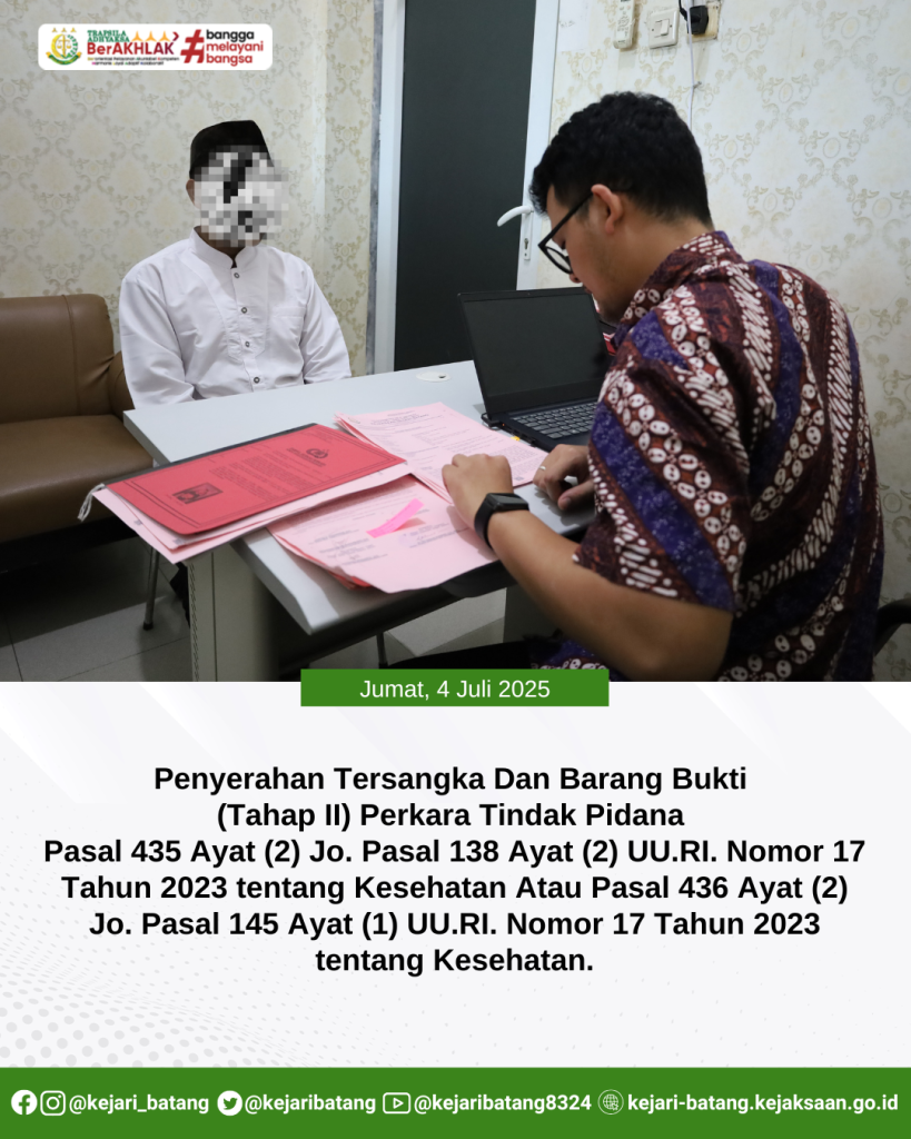 Telah dilaksanakan Penyerahan Tersangka Dan Barang Bukti (Tahap II) Perkara Tindak Pidana Pasal 435 Ayat (2) Jo. Pasal 138 Ayat (2) UU.RI. Nomor 17 Tahun 2023 tentang Kesehatan Atau Pasal 436 Ayat (2) Jo. Pasal 145 Ayat (1) UU.RI. Nomor 17 Tahun 2023 tentang Kesehatan, dari penyidik Polres Batang kepada Jaksa Penuntut Umum Kejaksaan Negeri Batang.