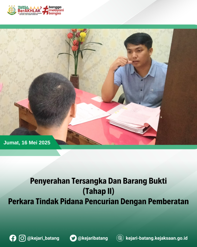 Telah dilaksanakan Penyerahan Tersangka dan Barang Bukti (Tahap II) perkara tindak pidana Pencurian dengan pemberatan dari Penyidik Polres Batang kepada Jaksa Penuntut Umum Kejaksaan Negeri Batang, Muhammad Saiful Tsani, S.H., M.H.
