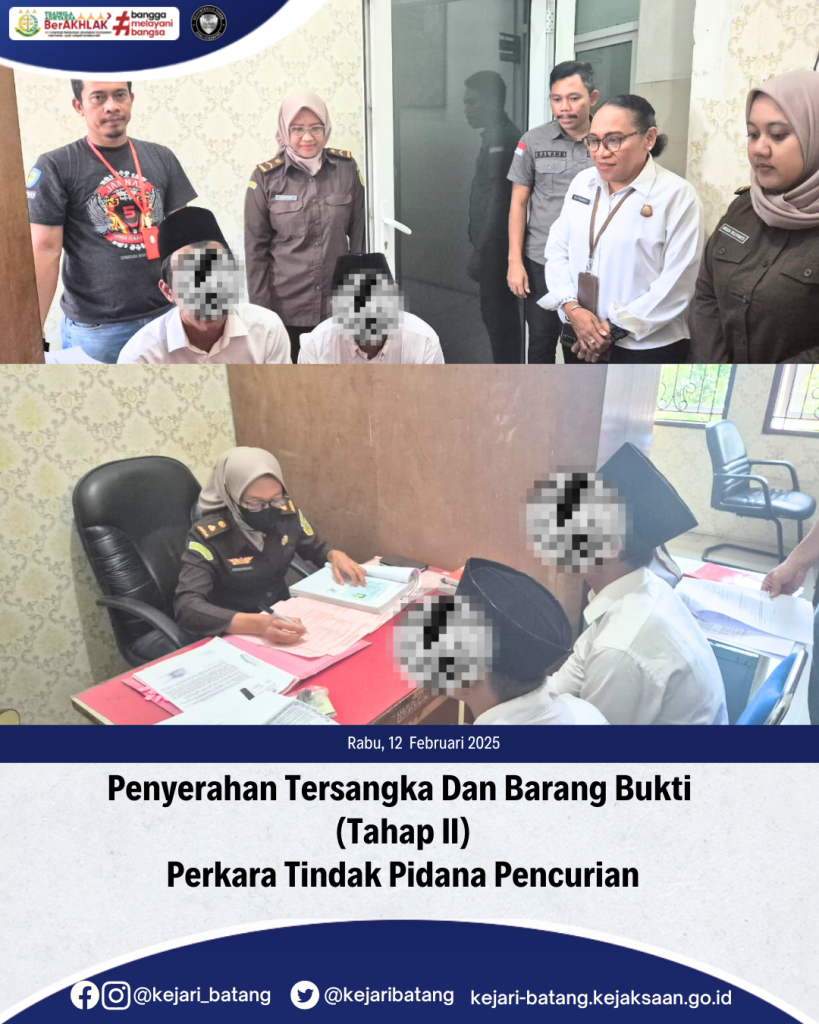Bahwa pada hari Rabu, 12 Februari 2025 bertempat di Kejaksaan Negeri Batang telah berlangsung Penyerahan Tersangka dan Barang Bukti (Tahap II) Perkara Tindak Pidana Pencurian sebagaimana diatur pada Pasal 363 ayat (1) ke-4 KUHP.