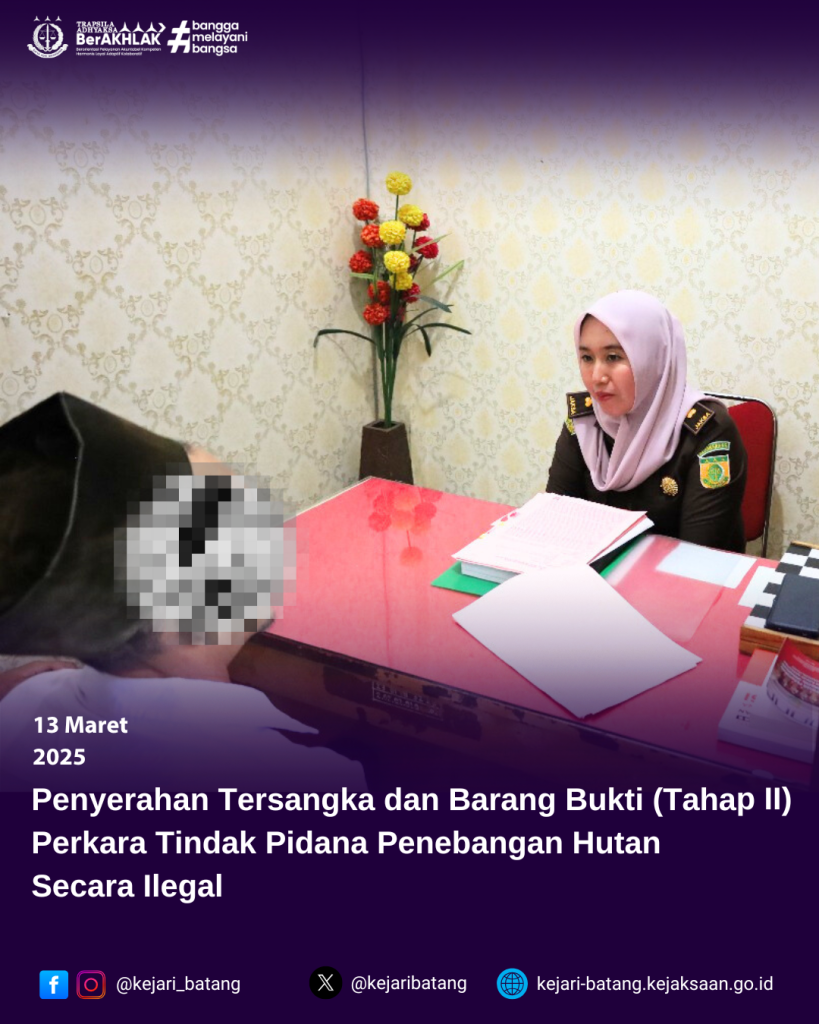 Bahwa pada hari Kamis, 13 Maret 2025 bertempat di Kejaksaan Negeri Batang telah berlangsung Penyerahan Tersangka dan Barang Bukti (Tahap II) Perkara Tindak Pidana Penebangan Hutan Secara Ilegal dari Polres Batang.