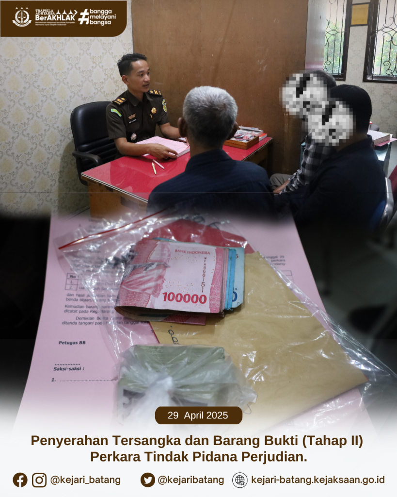 Bahwa pada hari Selasa, 29 April 2025 bertempat di Kejaksaan Negeri Batang telah berlangsung Penyerahan Tersangka dan Barang Bukti (Tahap II) Perkara Tindak Pidana Perjudian dari Polres Batang.